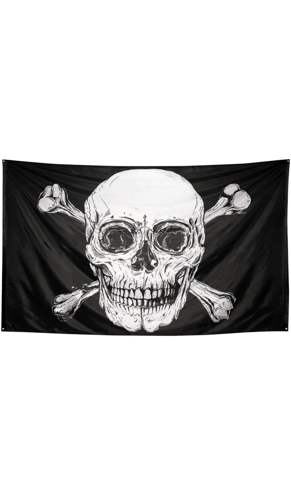 Drapeau Pirate Tête de Mort XXL pour le carnaval et les fêtes à thème. Cherchez les trésors perdus et naviguez les mers des Caraïbes en vous transformant en pirate ou corsaire. Un bateau avec une tripulation fidèle, un perroquet posé sur votre épaule, un sabre à la main et votre cache-oeil et vous serez le pirate le plus redouté de toutes les mers et océans.