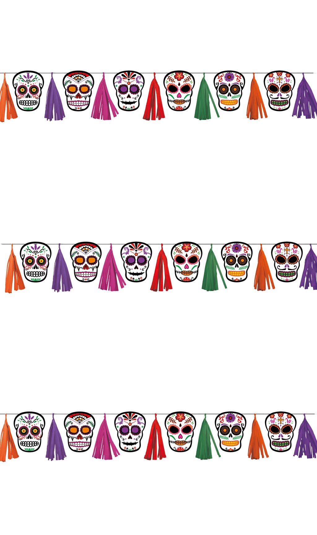 Guirlande de Dia de los Muertos pour Halloween. Recréez l´ambiance d´une nuit d´horreur avec vos amis ou en famille grâce à ces accessoires à thème Halloween. Vivants et morts seront invités: des sorcière et des magiciens, des zombis et des squelettes ainsi que des élégants vampires ou être de l´inframonde. Il viendront de l´enfers ou des limbes, des âmes en peine qui vagabonderont pendant toute une nuit de terreur.