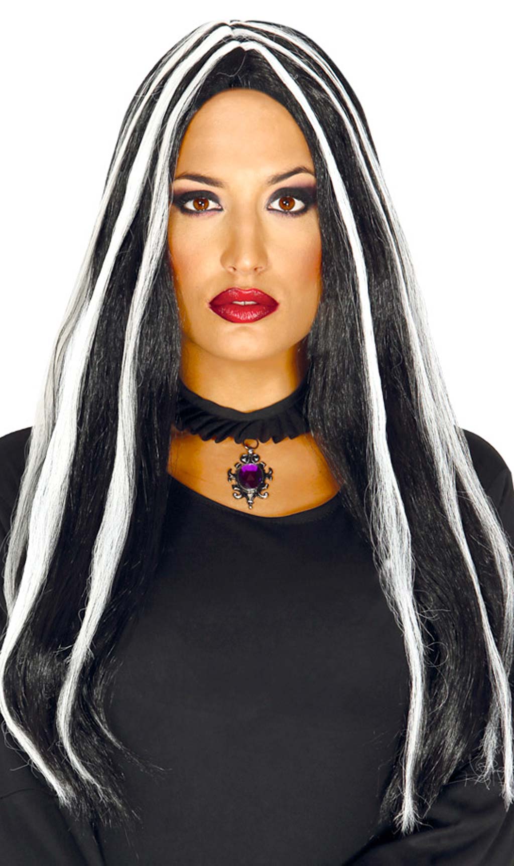 Perruque de style gothique avec des mèches fluorescentes. La perruque présente une longue et lisse chevelure qui constraste avec quelques mèches brillantes. L'esthétique de cette perruque la fait idéale pour des déguisements d'Halloween comme le déguisement de Morgane, Vampiresse ou Sorcière, entre autre.
